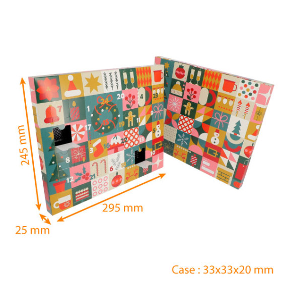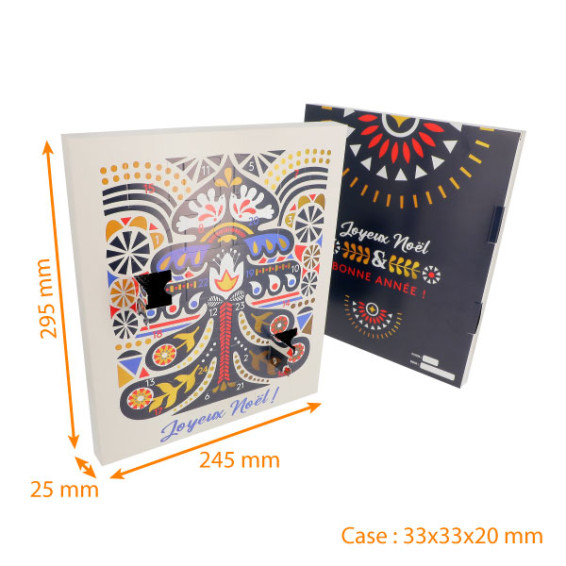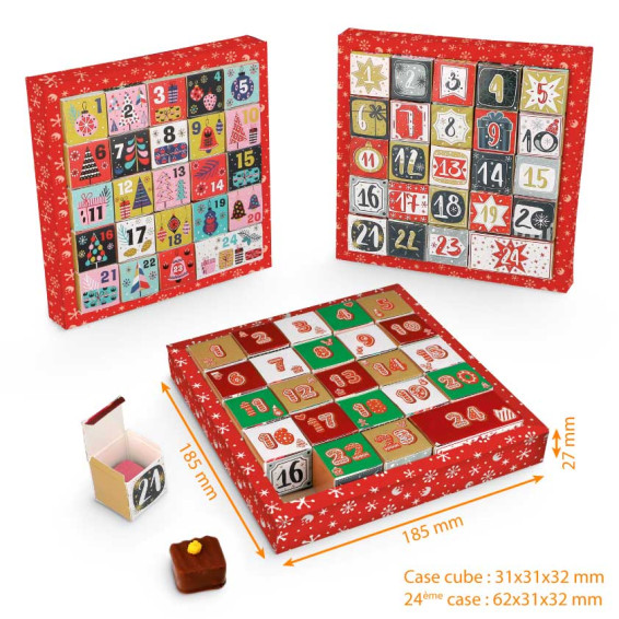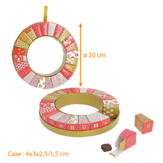 Cette année, Packeos vous propose différents modèles de calendrier de l'Avent et 1 couronne de l'avent ! Avec un design unique et novateur, ils mettront en valeur vos différentes douceurs de Noël (chocolats, bonbons de chocolat...) !